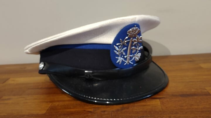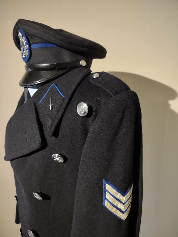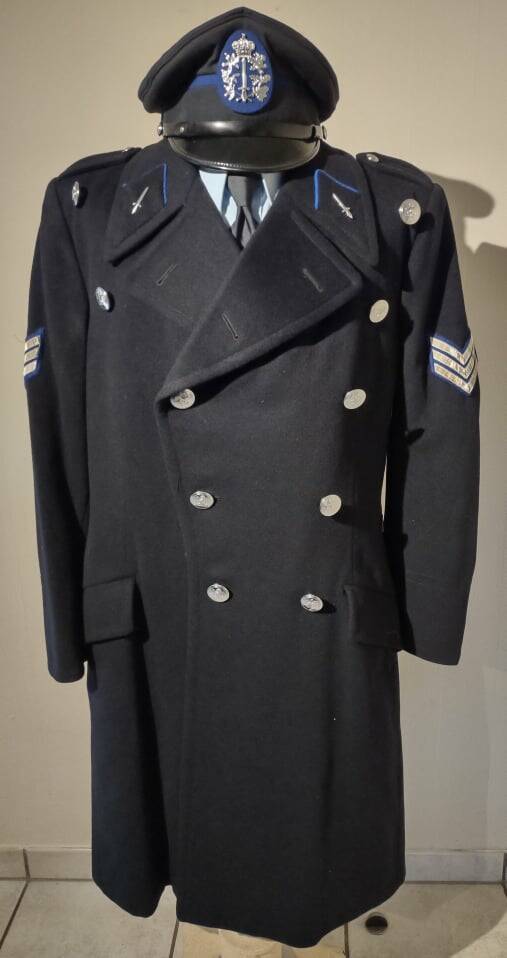 Deze wintermantel van agent-hoofdbrigadier werd gedragen van 1980 tot 1996.